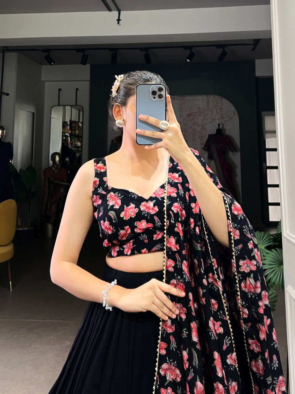 Lehenga Fabric : Dola silk Lehenga Work : Floral Print With Foil Work Lehenga Waist : SUPPORTED UP TO 42 Lehenga Stitching : Stitch With Canvas Length : 41 Flair : 3.50 Meter Inner : Micro Cotton Blouse (Unstitched) Blouse fabric : Tussar Silk Blouse Work : Floral Print With Foil Work Blouse Length : 0.80 Meter Dupatta Fabric : Dola Silk Dupatta work : Floral Print With Foil Work Also Comes With Both Side Tassels Dupatta Length : 2.5 Meter Package Contain : Lehenga, Blouse, Dupatta ,lehenga,floralprintlehenga,pattulehenga,lehengacholi,printedlehenagacholi,foilprint,printedlehengacholi,southindian,vonilehenga,halfsaree,bridesmaidoutfit,pattulehengacholi,pellikuthuru